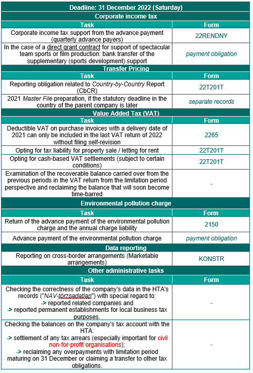 2022 year-end deadlines in Hungarian taxation
