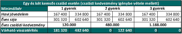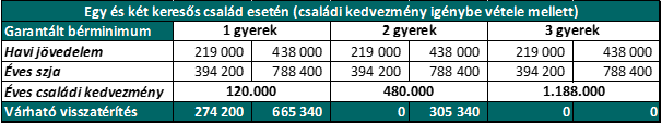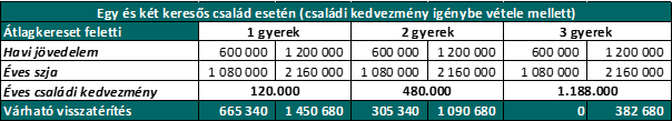 A táblázatból látszik, hogy a visszatérítés a két keresős egy és két gyermeket nevelők esetén a legmagasabb. De ilyen jövedelemszint esetén már a kétkeresős háromgyerekes családok is számíthatnak jelentős összegű visszatérítésre.